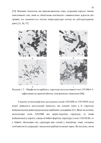 Рисунок 1.3 – Морфологія карбідів у структурі експлуатованої сталі 13CrMo4-5,