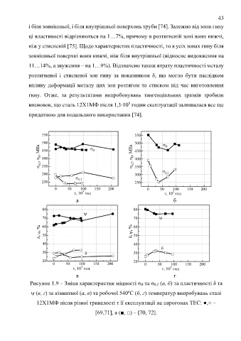 Рисунок 1.9 – Зміна характеристик міцності σ В та σ 0,2 (а, б) та пластичності δ та