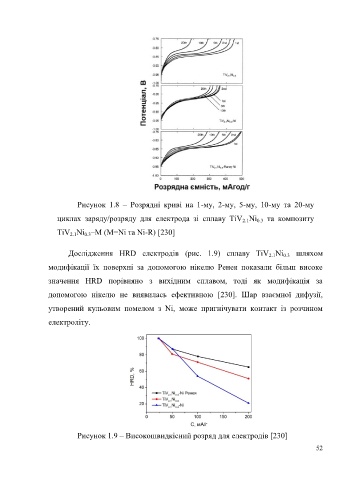 циклах заряду/розряду для електрода зі сплаву TiV Ni та композиту